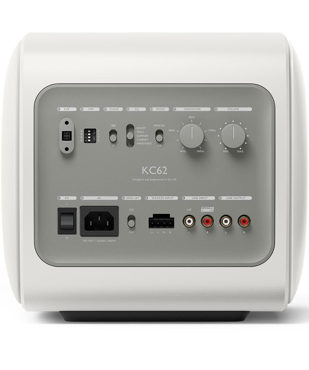 Наличие линейного высокочастотного выхода означает, что сабвуфер KEF KC62 можно использовать вместе с внешними активными динамиками, такими, как популярные полочные мониторы KEF LS50 или беспроводные KEF LSX.