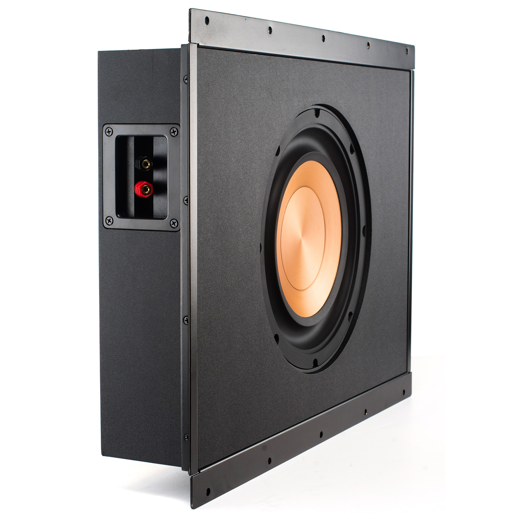 Пассивный сабвуфер Klipsch PRO-1000SW предназначен для установки в стены комнат при реализации различных инсталляционных проектов. Сабвуфер выполнен в закрытом корпусе из MDF, который обладает глубоким внутренним демпфированием. При этом корпус саба имеет небольшую монтажную глубину (всего 87 мм), что позволяет размещать его практически в любых пустотелых стенах. При этом наличие собственного корпуса не только защищает конструкцию Klipsch PRO-1000SW от повреждений, но и создает необходимый фиксированный рабочий объем для его низкочастотного динамика. Корпус отделан черной виниловой пленкой, устойчивой к механическим повреждениям.