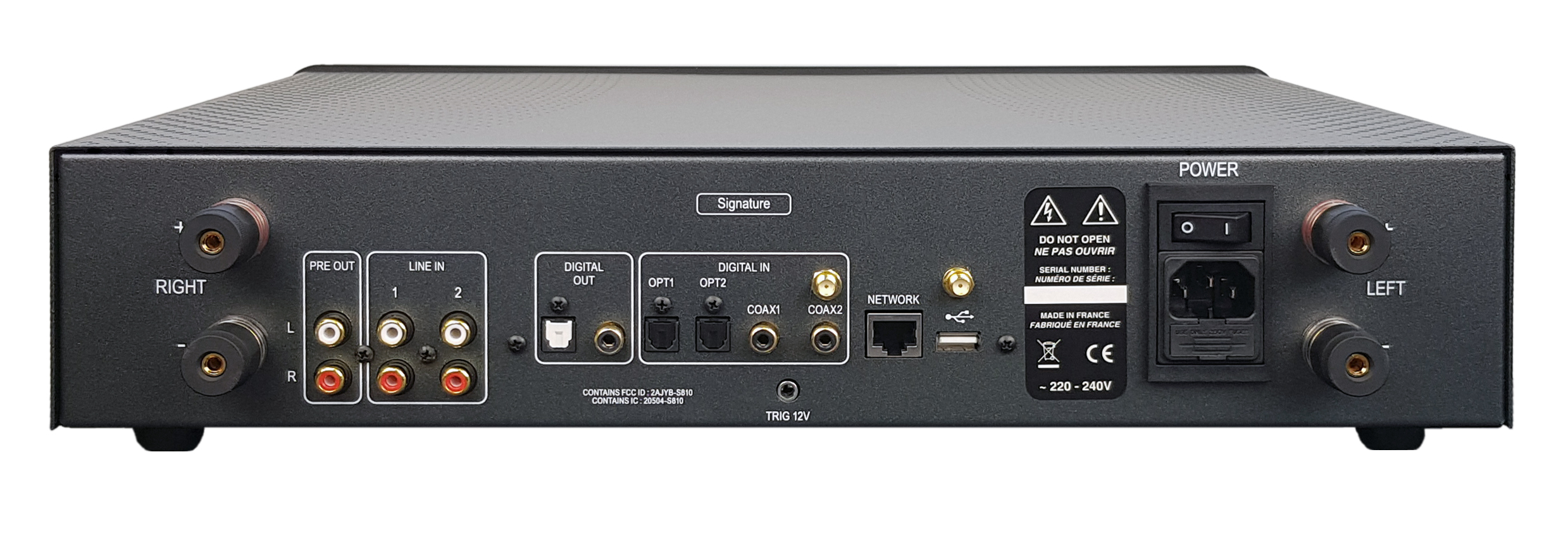 Входы тыльной панели: два линейных (RCA), LAN (Network), оптический, коаксиальный, USB (тип A), асинхронный USB (тип B, 24 бит/192 кГц) для подключения к компьютеру. Также имеется линейный выход RCA, триггерный выходной разъем, антенна Wi-Fi-модуля и две пары качественных винтовых клемм для АС.