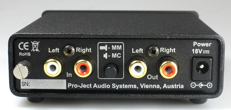 Несмотря на принадлежность к начальному уровню, Pro-Ject Phono Box DC имеет превосходное качество сборки и может работать с обоими типами головок звукоснимателя (с подвижной катушкой или с подвижным магнитом), что не так часто встречается среди недорогих моделей. Миниатюрный металлический корпус с квадратным основанием (103х103 мм) оснащен выполненной в минималистском стиле фронтальной алюминиевой панелью, на которой отсутствуют какие-либо элементы управления. В левом нижнем углу фасада находится рисунок с логотипом компании и маркировка устройства. Блок питания, потребляющий в дежурном режиме менее 1 Вт, вынесен в отдельный корпус с целью устранения влияния различных помех и наводок. На тыльной стороне имеется минимальный коммутационный набор для подключения Pro-Ject Phono Box DC к проигрывателю виниловых дисков и усилителю: вход и линейный выход, использующие качественные позолоченные разъемы RCA. Также есть сокет для подсоединения БП (18 Вольт), заземляющая клемма и кнопка выбора требуемого режима усиления, соответствующего MM- или MC-картриджам.