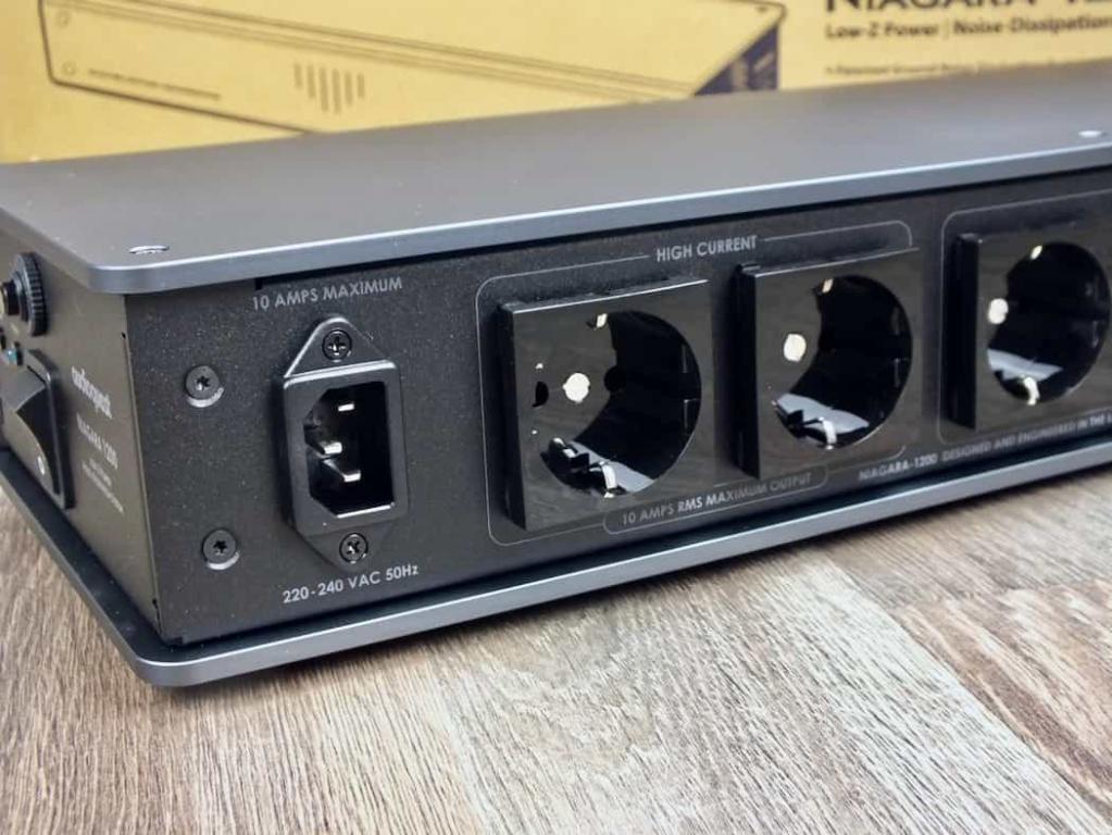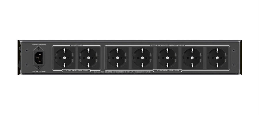Рациональная конфигурация корпуса позволила устанавливать его в нескольких вариантах — в том числе и вертикально. Это добавило удобства размещения, но никак не повлияло на работоспособность системы. Размеры корпуса позволят установить его в обычную стойку с аппаратурой. Новинка оснащена семью розетками серии NRG из бериллиевой меди с прямым покрытием толстым слоем серебра: две – с высокими токами и пять – с линейной фильтрацией шумов. Максимальный входной Niagara 1200 составил 15 А RMS.