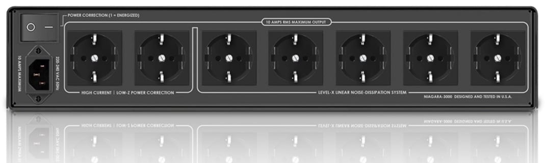 В устройстве используется фирменная патентованная технология AC Ground Noise-Dissipation System, представляющая собой высокоэффективную систему рассеивания фоновых шумов заземляющей шины. Такая система не оказывает влияния на общую безопасность и не провоцирует появление низкоуровневых контуров заземления. В AudioQuest NIAGARA 3000 задействована специальная линейная технология подавления шумов Level-X, которая работает в ультраширокой полосе и не приводит к возникновению множества резонансных пиков, что часто происходит в обычных сетевых кондиционерах. Модель также получила уникальную пассивную/активную цепь Transient Power Correction Circuit, которая занимается коррекцией процессов, связанных с питанием, и активируется посредством расположенного на тыльной панели корпуса переключателя. В данной цепи применяется токовый резервуар, позволяющий выдавать пиковые токи в 55 ампер, что особенно важно для питания и корректной работы оконечных усилителей с большим энергопотреблением. Благодаря такой схемотехнике удается избавиться от «просадки» динамики звучания. Для подключения усилителей и прочей сильноточной AV-техники (AV-ресиверов, активных сабвуферов и др.) на тыльной панели корпуса имеется отдельная пара розеток High Current, которые используют цепи дифференциального фильтрования с низким импедансом в тандеме с системой подавления шумов «земляной» шины, а также позволяют избавиться от такой проблемы, как компрессия тока. Остальные пять розеток, оснащенных линейной технологией подавления шумов Level-X, предназначены для аудио/видео-компонентов с небольшим потреблением тока. Контактные поверхности всех гнезд изготовлены из качественной меди с серебряным покрытием.