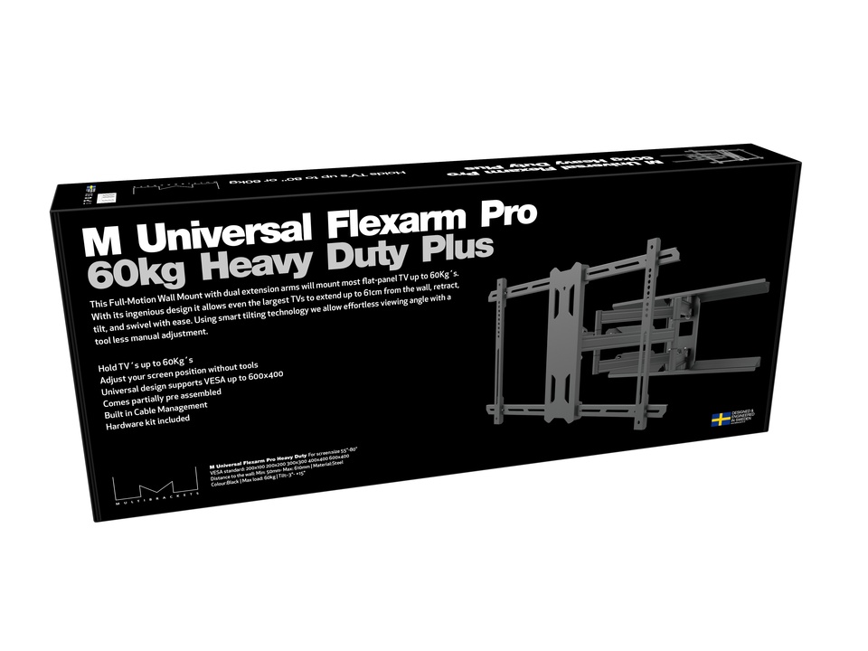 Это профессиональное настенное крепление Full Motion сконструировано с двумя удлинительными кронштейнами для надежного размещения большинства телевизоров с плоским экраном весом до 60 кг. Его инновационный дизайн позволяет даже самым большим телевизорам выдвигаться на расстояние до 55 см от стены, обеспечивая достаточно места для разнообразных положений просмотра. Благодаря возможности поворота на 80 градусов в любом направлении и надежному механизму наклона вы можете без усилий отрегулировать телевизор для достижения идеального угла просмотра. Крепление поддерживает размеры VESA до 700 x 400, что обеспечивает совместимость с широким спектром телевизоров. Он оснащен элегантным управлением кабелями, чтобы провода были организованы и скрыты от глаз, поддерживая чистую и аккуратную установку. Для дополнительного удобства в комплект входит полный набор болтов, упрощающий процесс сборки. Наша интеллектуальная технология наклона обеспечивает плавную регулировку без необходимости использования инструментов, гарантируя, что вы можете легко настроить положение экрана в соответствии с вашими предпочтениями. Независимо от того, устанавливаете ли вы его в гостиной, конференц-зале или развлекательном помещении, это настенное крепление предлагает как функциональность, так и стиль для оптимального просмотра. Низкопрофильный дизайн Настенное крепление M Universal Flexarm Pro 60 кг Heavy Duty Black оснащено уникальной наклонной головкой, разработанной для того, чтобы плотно прижать ваш телевизор с плоским экраном в пределах 5 сантиметров от стены. Его H-образная рама обеспечивает максимальный доступ к кабельным соединениям, что упрощает настройку и обслуживание. Наклон до совершенства Легкодоступный механизм наклона позволяет вам легко регулировать ваш телевизор на 15° вперед или на 3° назад. Как только вы найдете идеальный угол обзора, надежно затяните гайки, чтобы надежно зафиксировать телевизор на месте. Умная организация кабелей В нижней части рычагов-рычагов этого крепления есть четыре кабельных канала, каждый из которых предназначен для легкого доступа. Просто ослабьте винт, поверните кабельный канал в сторону, уложите кабели, а затем закрепите его обратно, вставив винт. Это позволяет вам прокладывать несколько кабелей по одной стороне или разделять кабели питания и HDMI по противоположным сторонам, обеспечивая гибкие и аккуратные решения по управлению кабелями, соответствующие вашим потребностям в установке. В комплект входит набор болтов для установщиков. Flexarm поставляется с маркированным набором болтов с различными диаметрами и длинами болтов, а также несколькими распорками для индивидуальной подгонки. В комплект входят болты с затяжкой и анкеры для бетона, что гарантирует вам наличие всего необходимого для надежного крепления к деревянным стойкам или бетонным стенам.