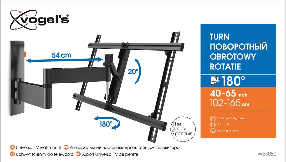 Вы хотите смотреть телевизор из нескольких мест в вашей комнате? В этом вам поможет полноподвижное крепление W53080 от Vogel's. Наслаждайтесь своими любимыми сериалами с дивана в ночное время, а затем включите телевизор, чтобы на утреннем столе завтрака было прекрасно видно утренние новости.