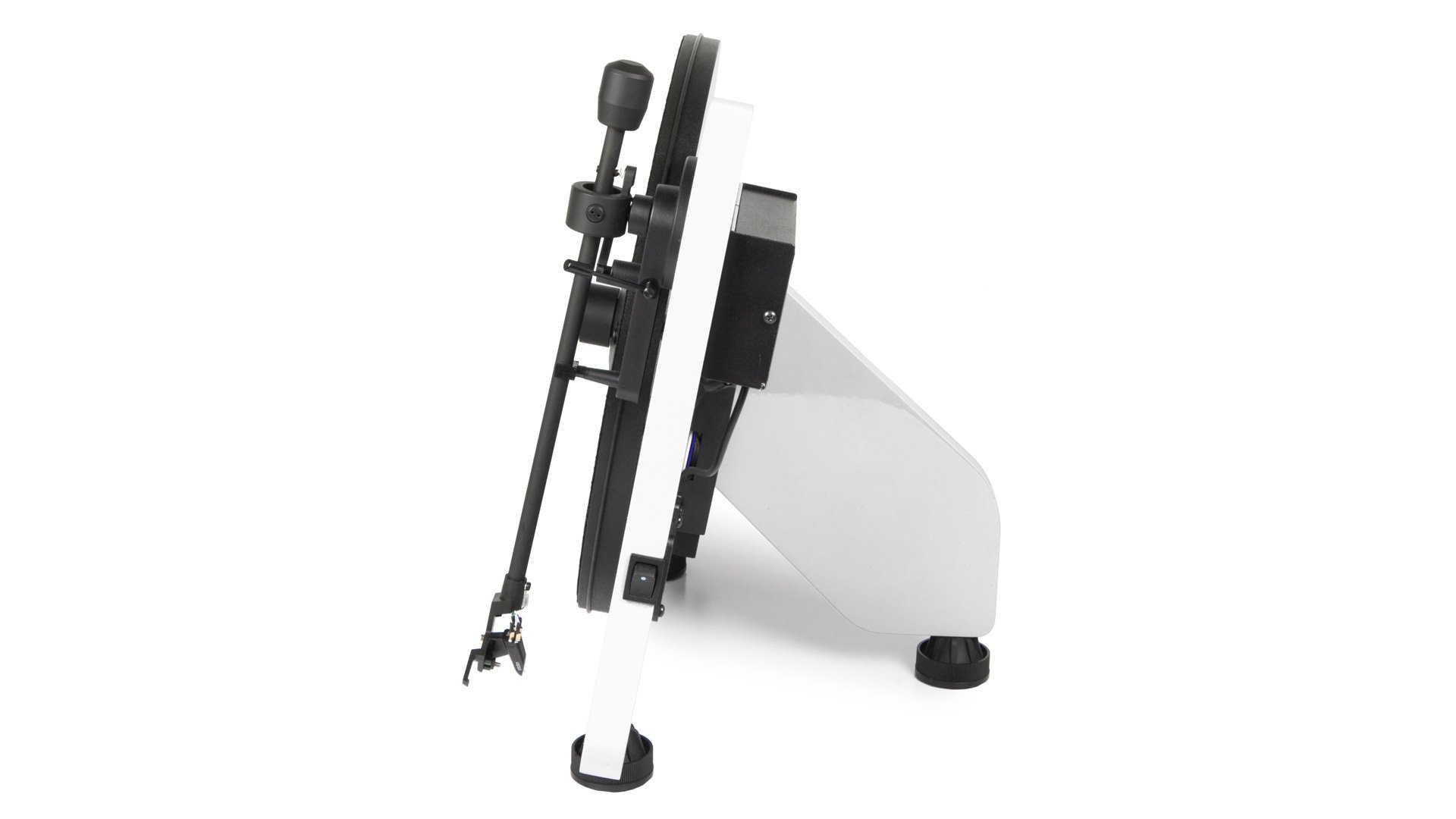 Вертикальный проигрыватель виниловых пластинок с возможностью настенного размещения, встроенный ММ-фонокорректор, Bluetooth-передатчик, тонарм из алюминия, пассиковый привод, опорный диск из алюминия весом 3,8 кг, ММ-картридж Ortofon OM5е, регулировка скорости 33 или 45 об/мин, габариты 430 х 310 х 130 мм, вес 2,8 кг.