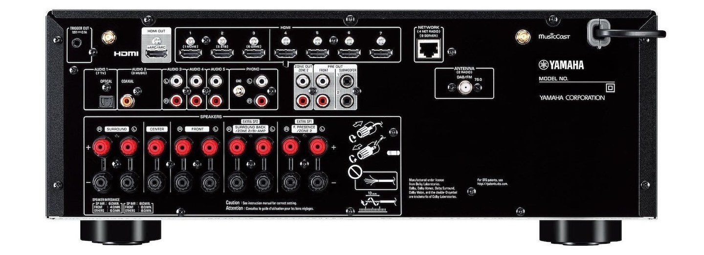 AV-ресивер Yamaha RX-V4A оснащен четырьмя HDMI-входами с поддержкой 8K / 60 Гц, 4K / 120 Гц Ultra HD и Dolby Vision. Также в данной модели предусмотрены аналоговые и цифровые входы для различных источников сигнала. Также на передней панели аппарата имеется USB-вход для накопителей с аудиофайлами. В данной модели предусмотрен и полный набор стриминговых технологий. Для подключения Yamaha RX-V4A к сети можно использовать Ethernet или Wi-Fi-подключения, также предусмотрены технологии Bluetooth и AirPlay 2.