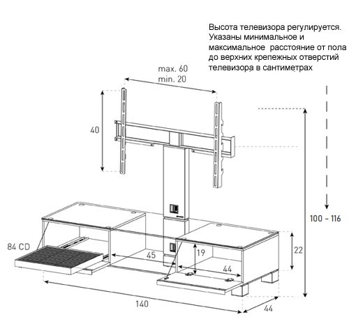 Надежная стойка под большие телевизоры с универсальным поворотным креплением из закаленного стекла с закругленными углами и полированной кромкой. Поворотное крепление подходит для всех видов плоских телевизоров (LCD, LED и плазма) и имеет возможность регулировки высоты. В задней ножке расположен кабель-канал для маскировки проводов и кабелей. Оснащена скрытой роликовой системой для плавного перемещения ТВ стойки вместе с телевизором и другой аппаратурой. Стойка предназначена для телевизоров с диагональю 32-75 дюймов (весом до 50 кг). Крепление поддерживает форматы 20x20, 30x30, 40x40 и 60х40. Возможно оснащение увеличенным креплением (80x45). Выдвижной ящик оснащен системой мягкого и бесшумного закрытия.