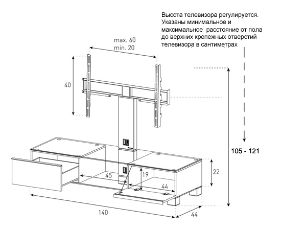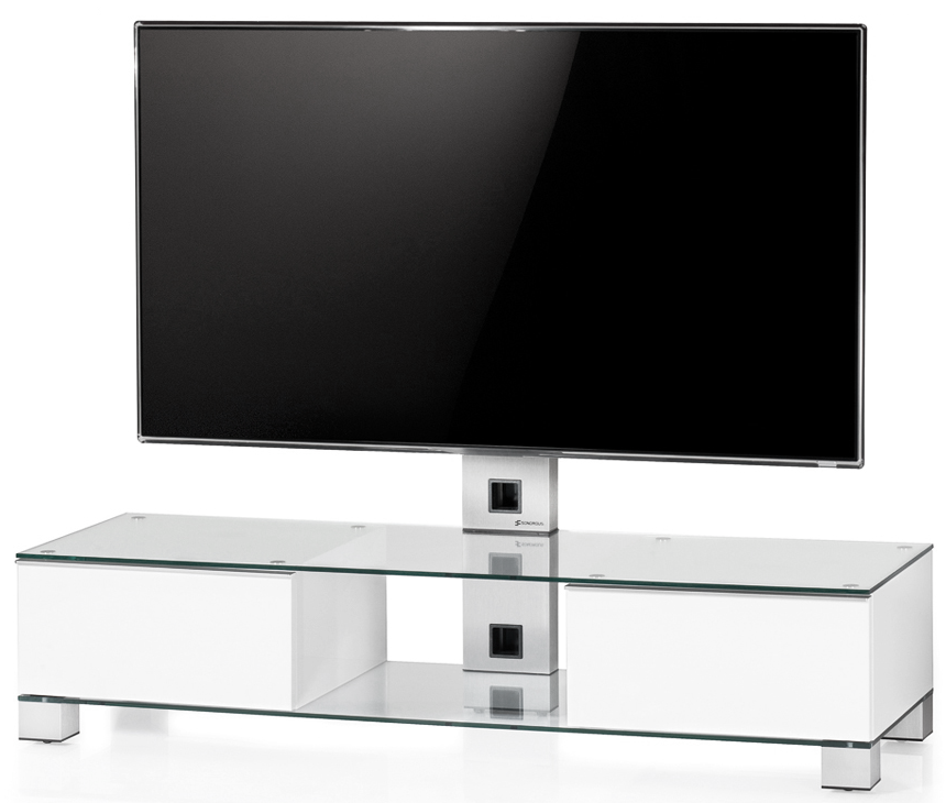 Надежная стойка под большие телевизоры с универсальным поворотным креплением из закаленного стекла с закругленными углами и полированной кромкой. Поворотное крепление подходит для всех видов плоских телевизоров (LCD, LED и плазма) и имеет возможность регулировки высоты. В задней ножке расположен кабель-канал для маскировки проводов и кабелей. Оснащена скрытой роликовой системой для плавного перемещения ТВ стойки вместе с телевизором и другой аппаратурой. Стойка предназначена для телевизоров с диагональю 32-75 дюймов (весом до 50 кг). Крепление поддерживает форматы 20x20, 30x30, 40x40 и 60х40. Возможно оснащение увеличенным креплением (80x45). Выдвижной ящик оснащен системой мягкого и бесшумного закрытия.