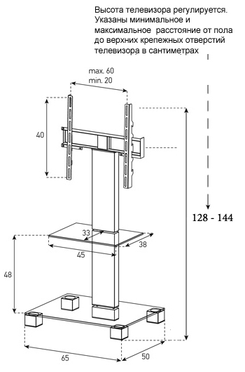 Надежная стойка под телевизоры с универсальным поворотным креплением из закаленного стекла с закругленными углами и полированной кромкой. Поворотное крепление подходит для всех видов плоских телевизоров (LCD, LED и плазма) и имеет возможность регулировки высоты. В задней ножке расположен кабель-канал для маскировки проводов и кабелей. Стойка предназначена для телевизоров с диагональю 37-65 дюймов (весом до 50 кг). Крепление поддерживает форматы 20x20, 30x30, 40x40 и 60х40. Возможно оснащение увеличенным креплением (80x45).